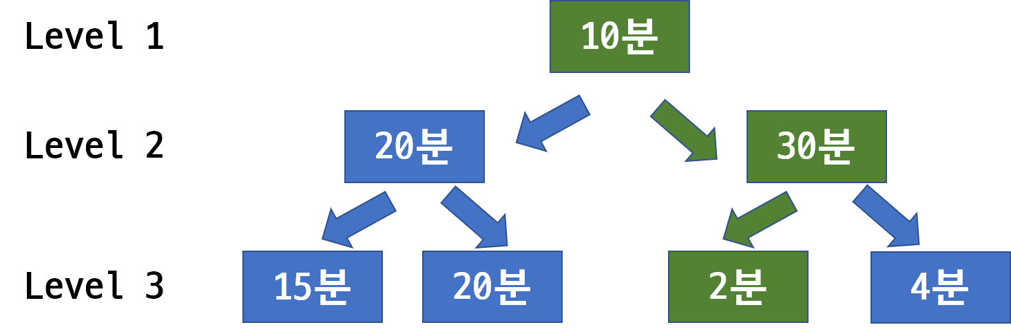 각 그림의 적힌 숫자는 문제를 푸는데 걸리는 시간이고 우리는 가장 빠른 시간안에 level1, level2, level3문제를 하나씩 해결하려 한다. 이때 문제를 푸는 시간을 최소화 하려면 어떻게 해야 할까?