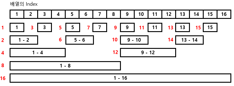 12번인덱스는 4개의 구간합을 가지고 12번부터 앞으로 4칸인 9~12번 구간의 합을 가진다.