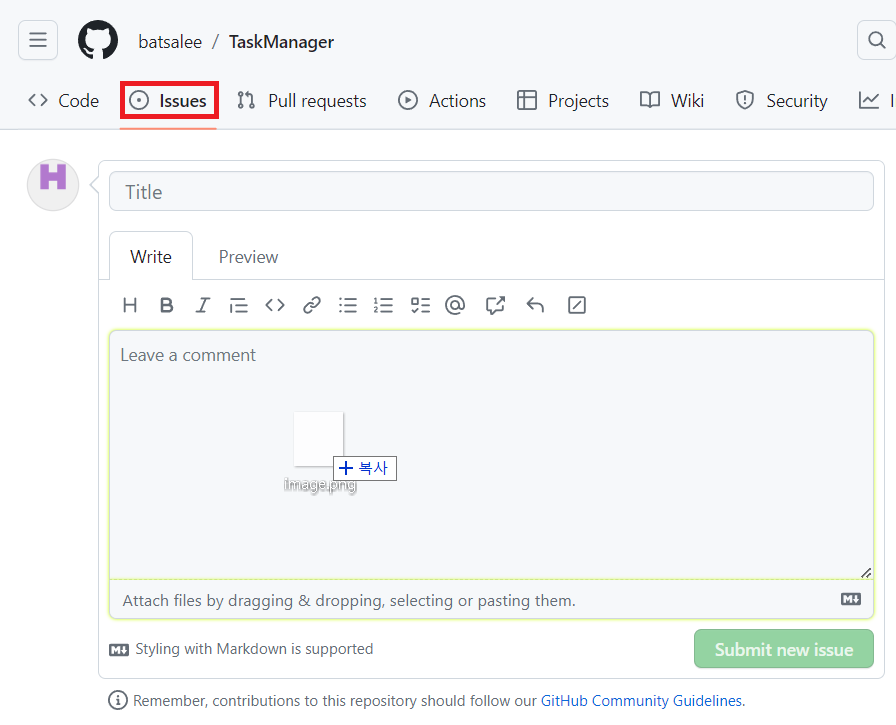 방법은 아무 레포지토리의 Issues탭에 New Issue로 아래처럼 글쓰기 상태를 만들고 이미지파일을 드래그해서 내용쪽에 드랍합니다.