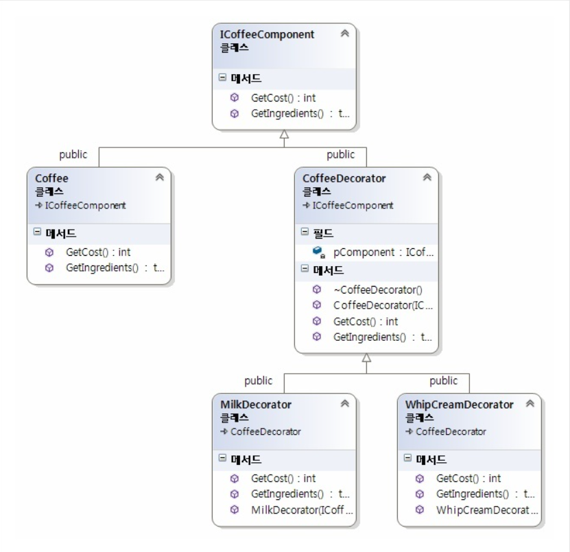상위 클래스인 CoffeeDecorator의 함수를 호출 후 거기에 추가작업을 수행해서 return하는 것이 핵심