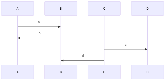 위와 같은 시퀀스 다이어그램이 있을 때 a - > b와 c가 별개의 수직선에 있다.