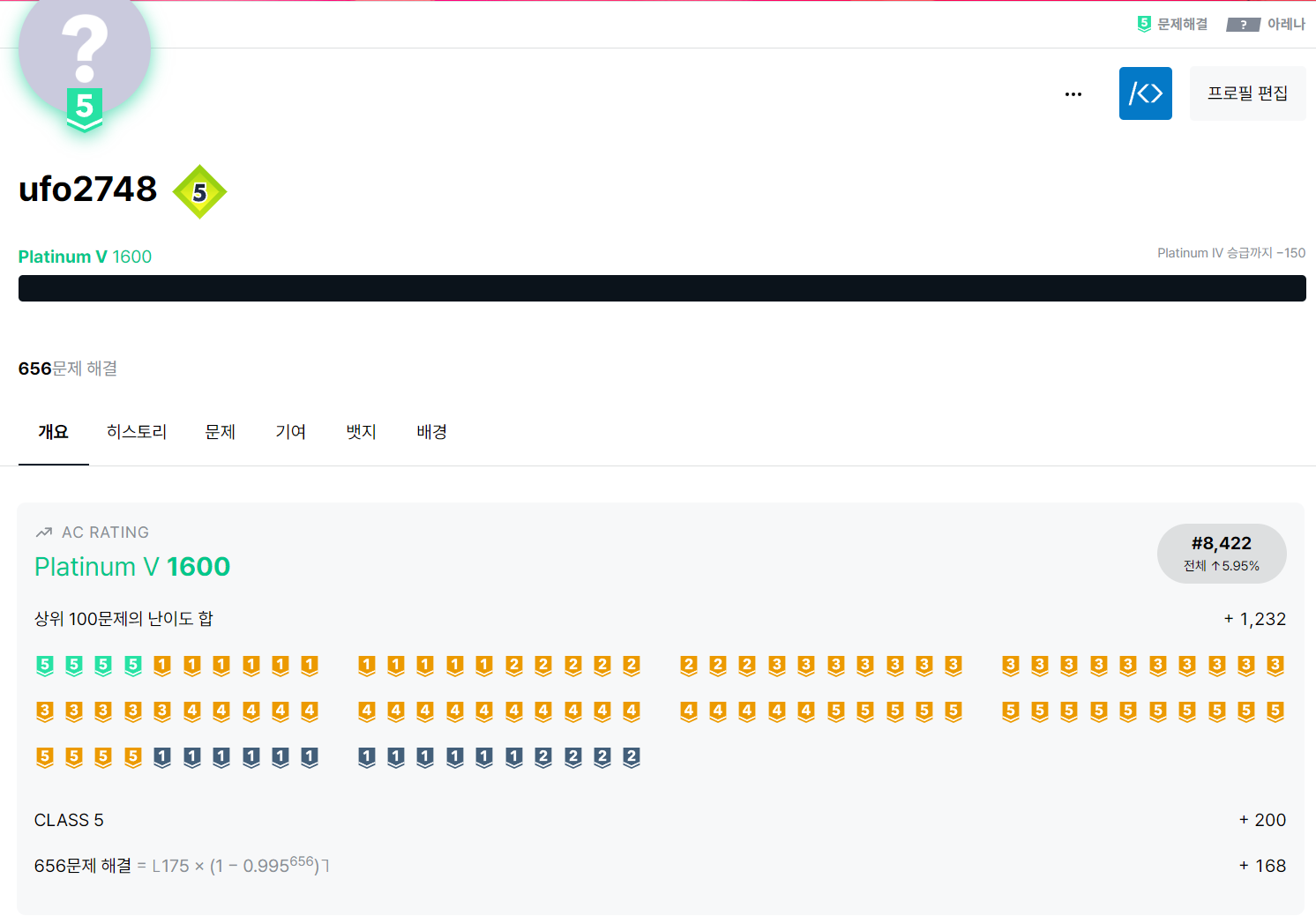 드디어 백준 solved ac 플래티넘 티어를 달성했다.