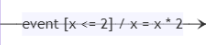 세번째 화살표의 경우 x <= 2 조건(가드)이 맞으면 event(트리거)가 발생해서 x = x * 2 행동(액티비티)을 하고나서 상태가 바뀐다는 뜻이 된다.