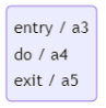 위의 상태의 경우 해당 상태로 입장시 a3행동을 하며, 해당 상태를 유지한 동안은 a4행동을, 나갈땐 a5행동을 한 후 나간다라는 의미가 됨