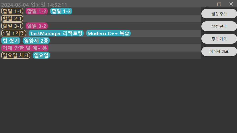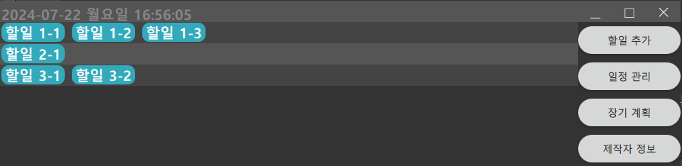 어쩌면 오늘 조금 휴식한 후, 어쩌면 내일 리팩토링은 끝날듯하고 리팩토링으로 인해 쉽게 사용 가능하던 프로그램이 json이라는 구조를 사용하면서 더 복잡해진만큼 일정관리를 gui로 할 수 있게 하는 기능구현이 최우선일듯하다.