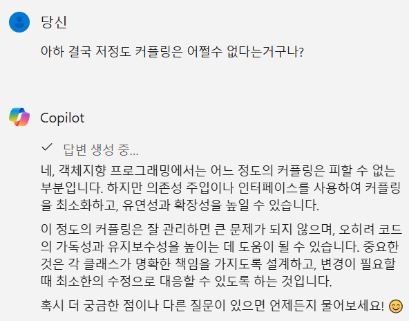 또한 가장 집착했고 고민했던 부분은 코드의 재사용성 내지는 각 클래스간 커플링의 최소화였는데 결국 객체지향 프로그램이라는게 어느정도의 커플링은 발생할 수 밖에 없고 그걸 최소화하는게 최선이라고 결론지었다.