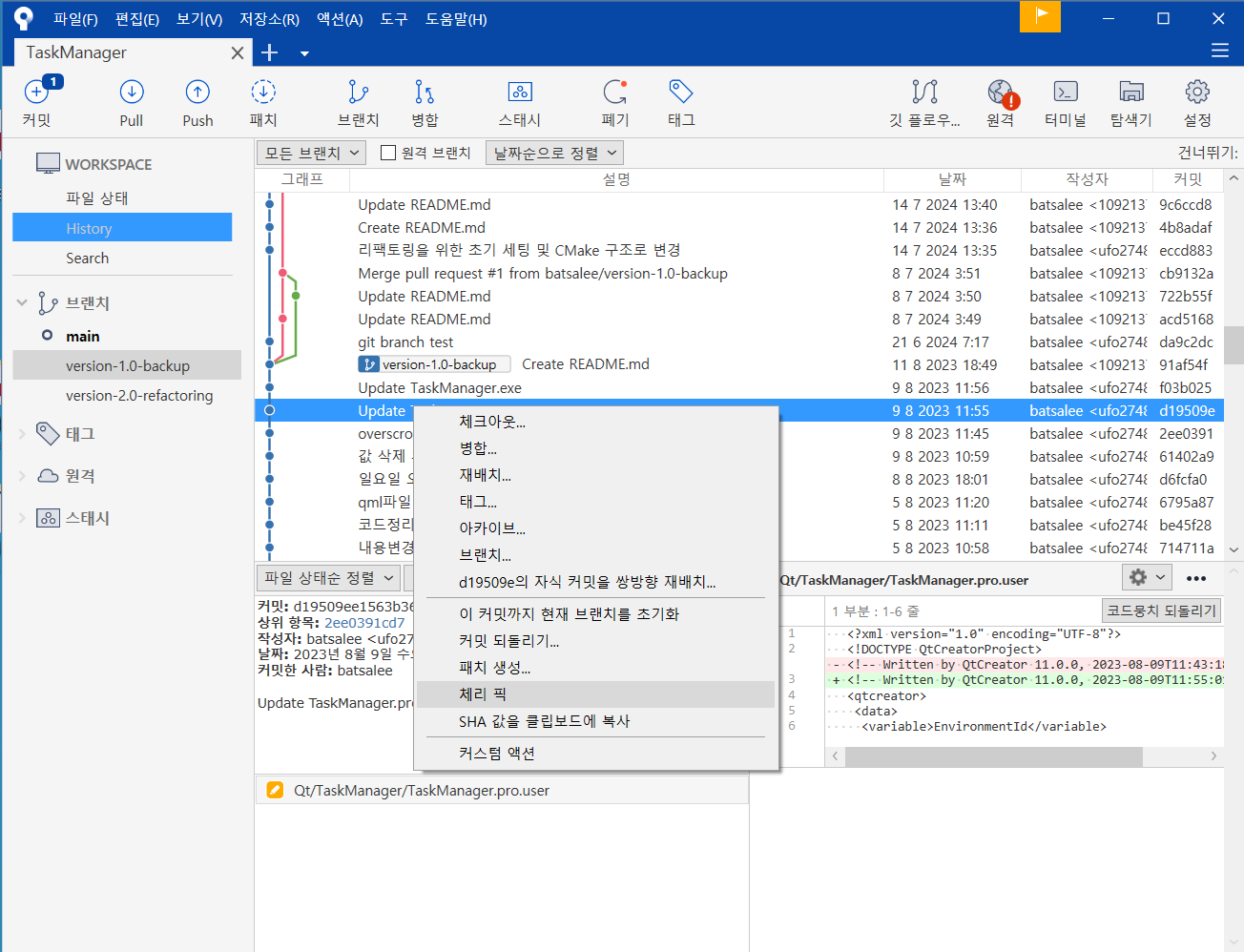 2) 체리픽 해올 커밋의 브랜치로 가서 해당 커밋 우클릭 후 체리 픽