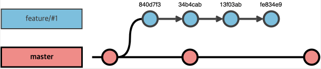 위와 같은 상황일 때 feature/#1 브랜치의 커밋 중 34b4cab와 13f03ab 커밋을 master 브랜치에 적용하고 싶다면 아래와 같이 사용한다.