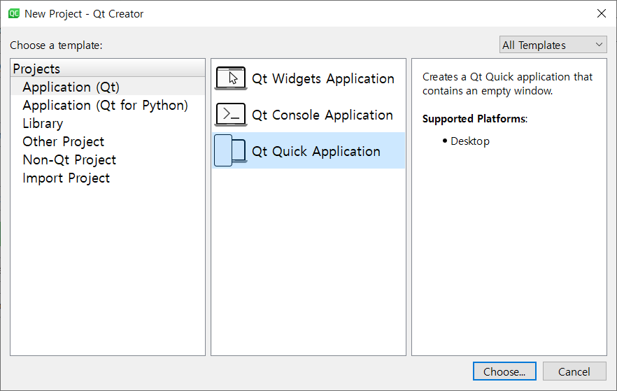 2. 왼쪽에 Application (Qt)선택하고 가운데에 Qt Quick이면 Qt Quick선택, QWidget이면 Qt Widget선택